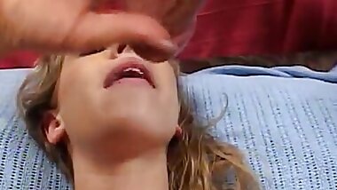 Blonde teen gets her pussy and mouth drilled deep by a muscular man with huge dick