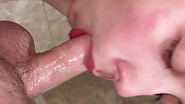 Cute and submissive girlfriend giving a deep and sloppy blowjob to a big dick