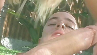 "Pretty young blonde in black lingerie fucked in the ass and swallows cum"