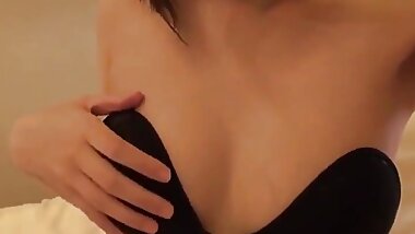 "Cute coeds with great tits run a train on lucky camera guy's cock in bedroom"