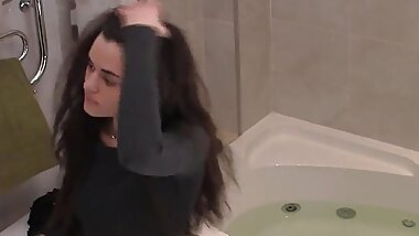"Brunette touching her titties and bald twat in the bathtub like she wants to masturbate"