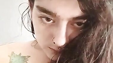 "A slim dark haired babe from Germany playing with her partner's massive tits"
