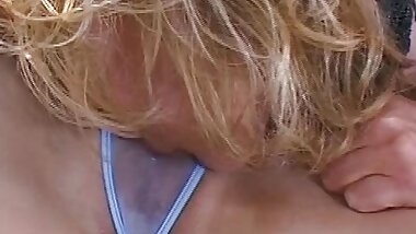 "A blonde in a chic dress and red lipstick caresses her hairy pussy through her panties"
