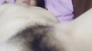 "Horny asian masturbating and playing with her natural big boobs and her tight pussy"