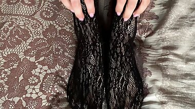 "Girl caresses her legs and gives a blowjob to the guy behind the scenes with moans"
