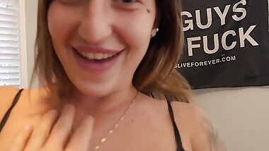"Will this naughty pregnant girl still be able to handle rolls and milk in her tight pussy?"