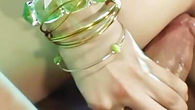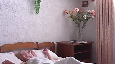 "A slender blonde with an appetizing ass gives a guy a blowjob and gets a sperm on his face"