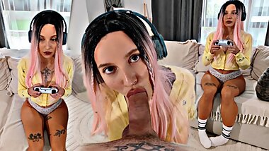 "She wants to surprise her boyfriend with a BJ and is already practicing on her stepbrother!"