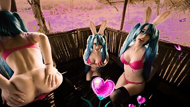 "Stunning cosplayergirl gets banged bareback in jungle tree house, MIKU IN WONDERLAND"